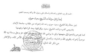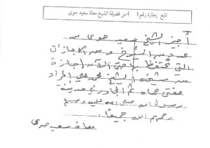 إجازة الشيخ معاذ حوى بمؤلفات والده الشيخ سعيد حوى رحمه الله تعالى